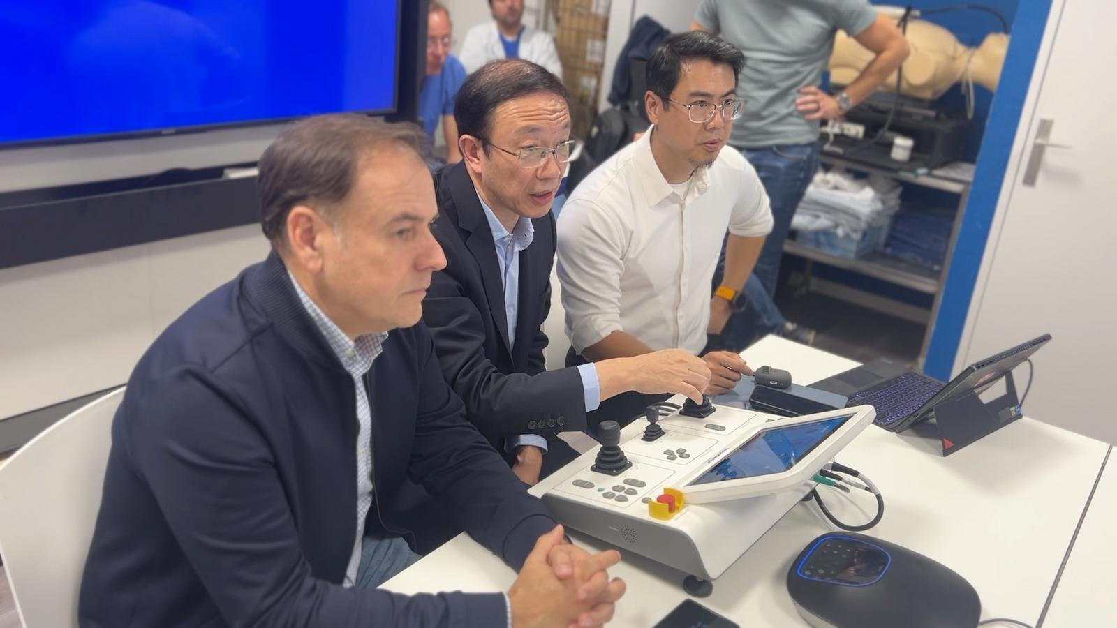 王焱主委在法国操作机器人控制器 手术在中法两地同时展开。在法国波尔多,农工党厦门市委主委、厦心医院院长王焱教授与波尔多大学医院成人结构性心脏病介入科负责人利奥内尔·勒鲁并肩操作,通过高速、低延时的国际网络,实时接入厦门的机器人操作系统,对二尖瓣病变区域进行精准导航与远程操控;在厦门导管室内,机器人在无本地操作者的情况下精确运转,在跳动的心脏上完成瓣膜定位、夹合等高难度操作;厦心医院心脏介入、麻醉、超声及护理团队实时监测患者生命体征与系统运行状态。手术历时约1小时,跨国通信信号稳定,操作精度达到亚毫米级。患者术后恢复良好,二尖瓣反流近乎为零,现已康复出院。