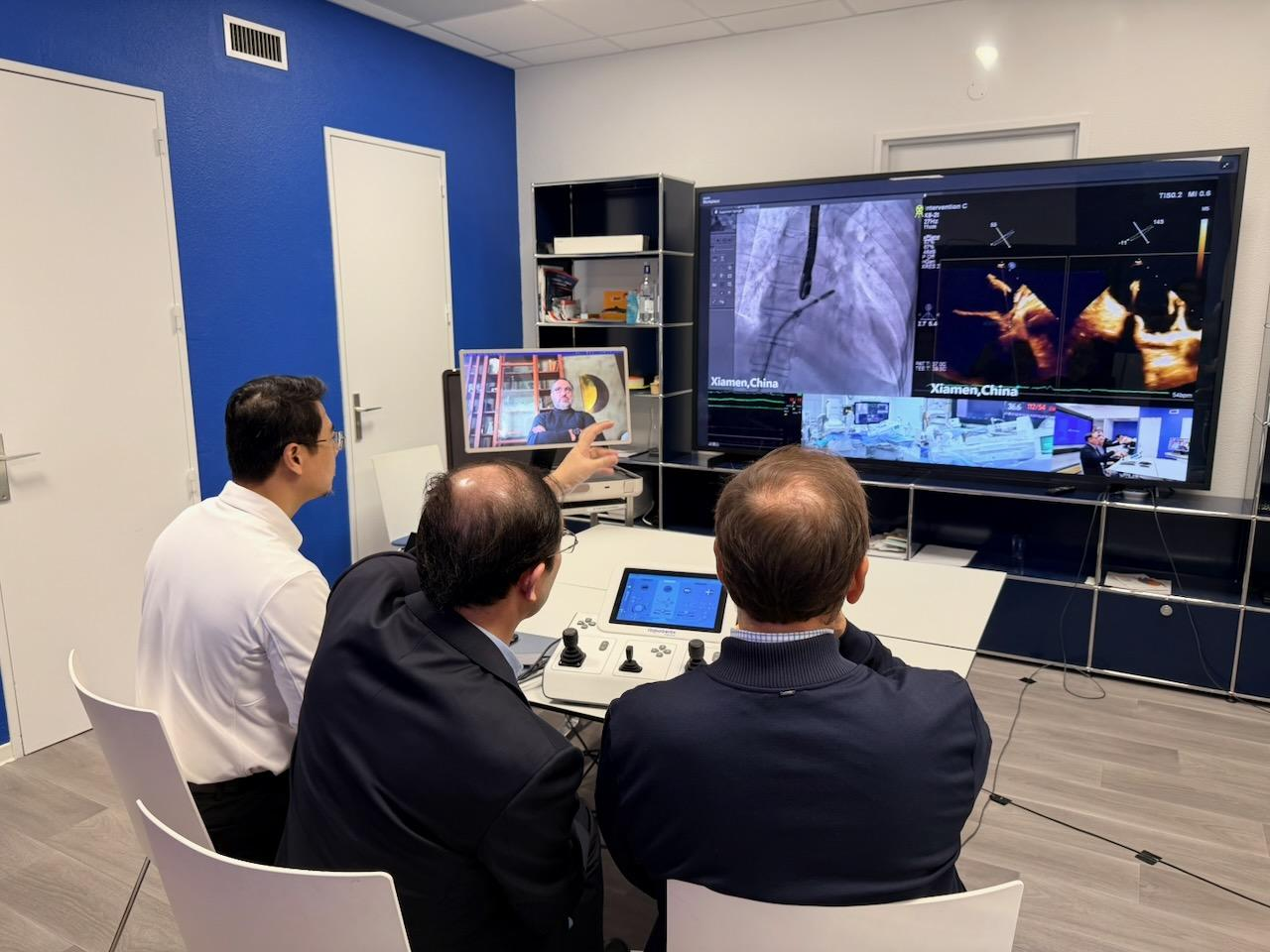 10月23日,厦门大学附属心血管病医院(以下简称“厦心医院”)顺利实施全球首例跨国远程机器人辅助经导管心脏介入手术。中法专家通过远程控制平台,协同操纵位于厦门导管室内的机器人系统,为一名患者成功完成机器人辅助经导管二尖瓣修复术(TEER)。该手术跨越欧亚大陆、通信传输距离超过1万公里,实现两国专家实时联动、同步精密操控。