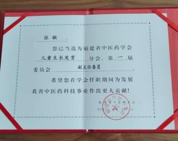 张敏受聘福建省中医药学会儿童生长发育分会首届副主任委员