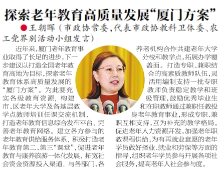 1月11日下午,王朝晖代表市政协教科卫体委、农工党界别作《完善老年教育体系 建设老年友好型社会》大会口头发言,并接受厦门电视台记者采访。此外,农工党界别提交的《进一步提高我市心理健康服务水平 促进高水平健康之城建设》入选大会书面发言。