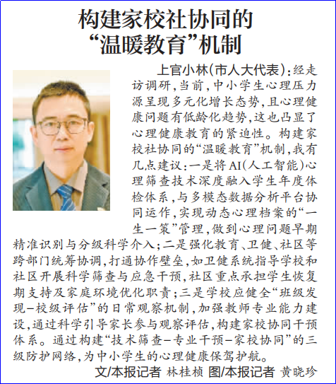 在大会发言环节,王朝晖代表农工党界别作题为《推动“AI消费”有效落地 为高质量发展注入“智能动力”》口头发言。此外,农工党市委提交的《关于我市高水平打造赛事区域中心城市的建议》,农工党界别提交的《关于“大食物观”下加快厦门“蓝色粮仓”建设的建议》《关于我市探索构建“自净城市”,进一步提升生态环境治理能力的建议》,入选书面发言。