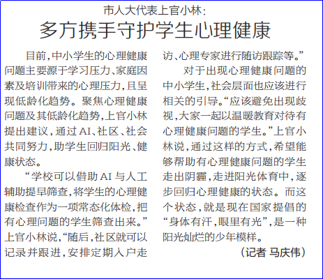 《海西晨报》报道 谢强、柯明月、上官小林、孙勇、陈佳成五位党员作为市人大代表参加了市人大十六届六次会议,为此次大会带来了各自的代表建议。厦门市人大常委会委员、农工党厦门市委会副主委谢强作为大会主席团成员参与了大会各项议程。