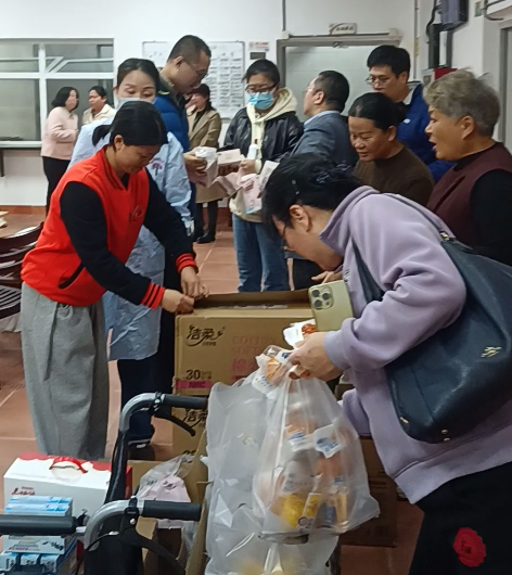 义诊区的另一侧,党员代表们正忙着搬运和整理爱心物资。轮椅、面巾纸、面包、切菜机、小收音机……一箱箱实用的生活物资,凝聚着大家对老人们的贴心关怀。当志愿者把物资送到老人手中时,一位奶奶拉着志愿者的手笑着说:“你们想得太周到了,心里暖暖的。”
