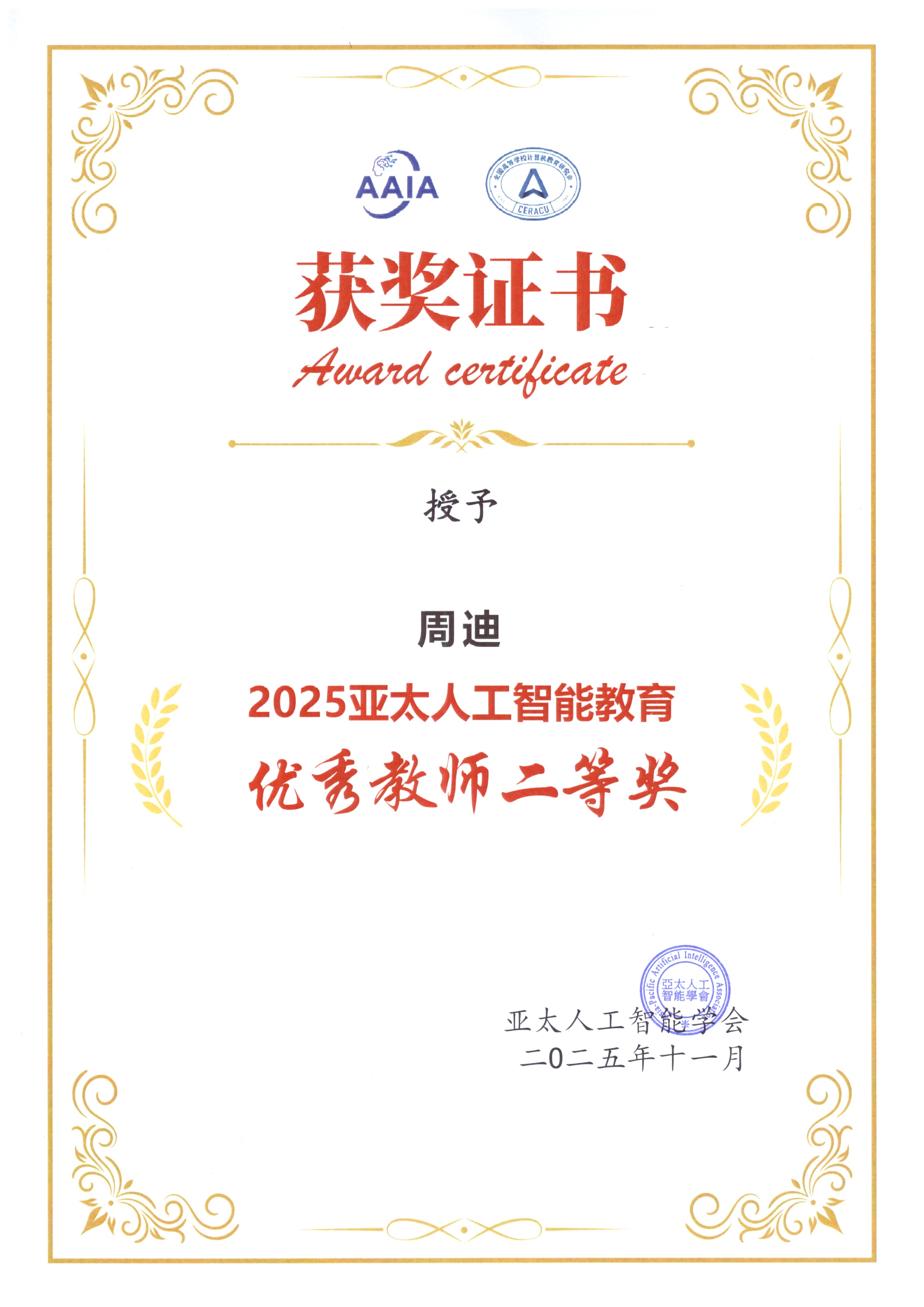 周迪获2025亚太人工智能教育优秀教师二等奖
