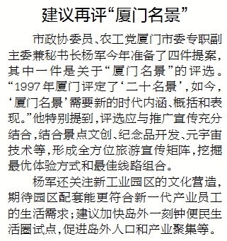 主席台前排右三为王焱 在1月9日报到当天,杨军就《建议我市再次评选厦门名景》等4项个人提案接受了厦门电视台、《厦门晚报》和《海西晨报》记者的采访。