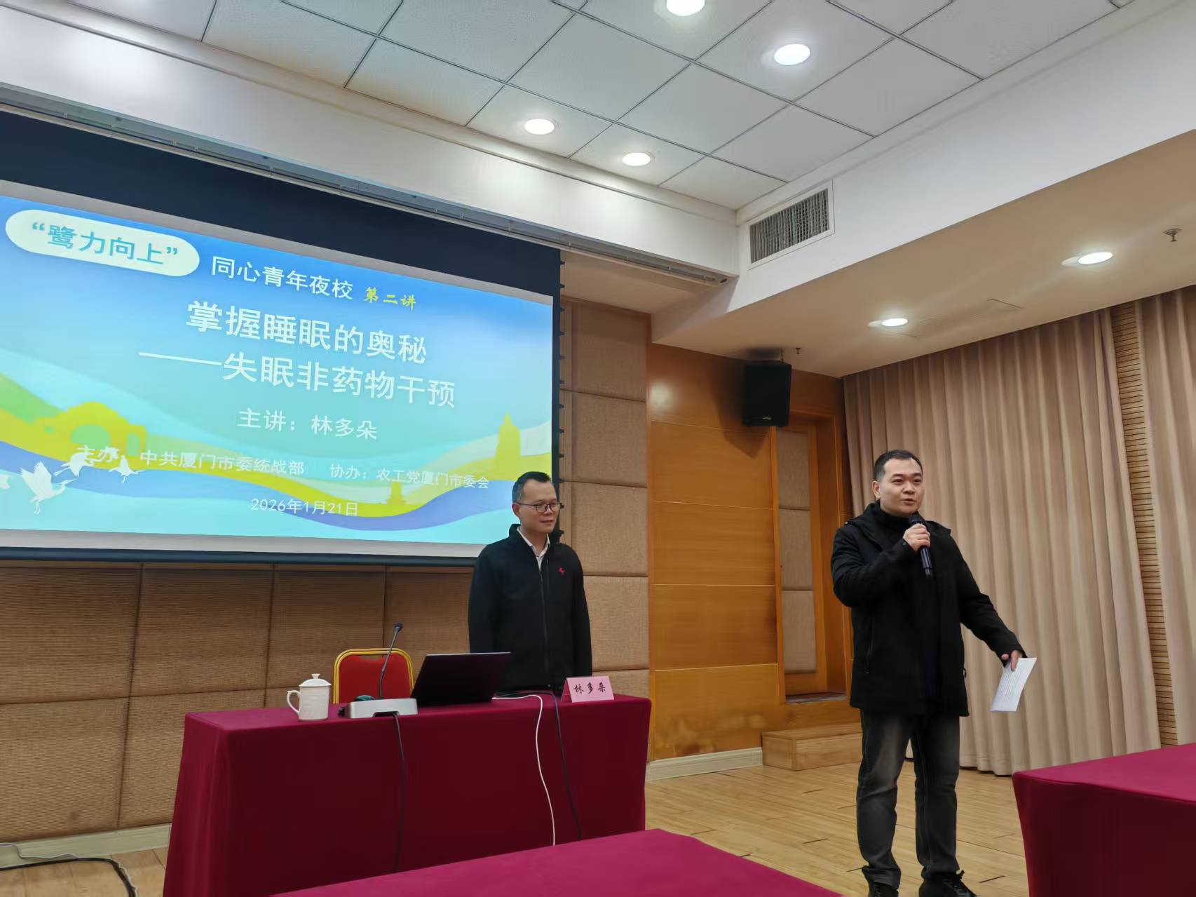 近日,市委统战部举办第二期“鹭力向上”同心青年夜校,持续深化“鹭力传薪 鹭青挺膺”厦门市民主党派青年工作品牌建设,整合民主党派资源优势,赋能民主党派青年成长。 此次夜校由农工党厦门市委会协办,特邀农工党厦门市委会青工委主任、厦门市仙岳医院副院长林多朵作题为《掌握睡眠的奥秘——失眠非药物干预》的课程,为在场的近50位民主党派青年成员解锁“睡眠密码”,改善睡眠质量。农工党厦门市委会组织处处长高毅参加并主持活动。