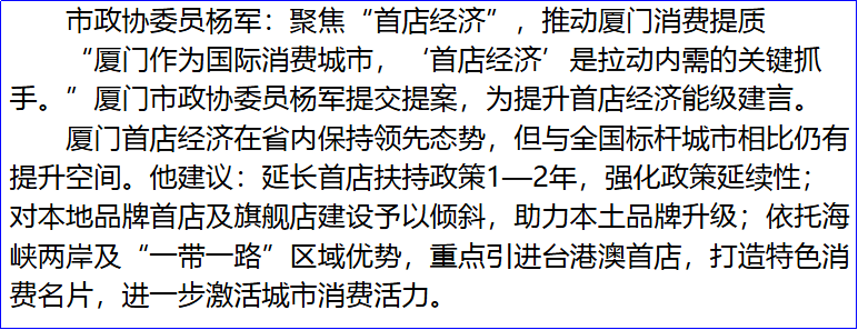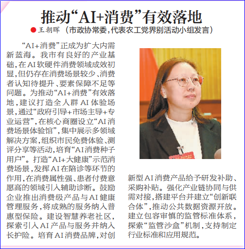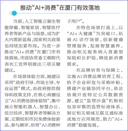 在大会发言环节,王朝晖代表农工党界别作题为《推动“AI消费”有效落地 为高质量发展注入“智能动力”》口头发言。此外,农工党市委提交的《关于我市高水平打造赛事区域中心城市的建议》,农工党界别提交的《关于“大食物观”下加快厦门“蓝色粮仓”建设的建议》《关于我市探索构建“自净城市”,进一步提升生态环境治理能力的建议》,入选书面发言。
