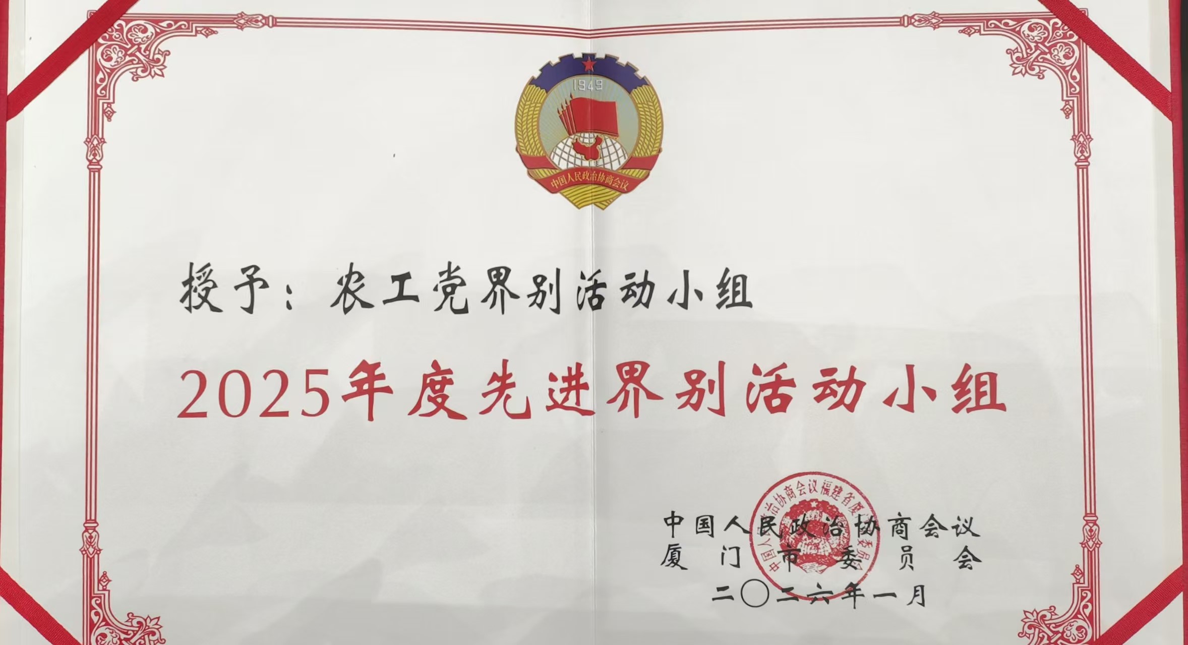 《海西晨报》报道 大会开幕会上宣读了市政协2025年度各项表扬决定。其中,农工党界别以总分第一获评先进界别活动小组,杨军获评优秀界别活动小组召集人,杨军、王朝晖获评优秀市政协委员,农工党市委提交的《完善社区照料中心功能,更好推动社区居家养老服务健康良性发展》与另外1篇提案并案后的重点提案《建议优化养老照料中心扶持政策,助力我市养老事业高质量发展》获评优秀提案,邓楠获评优秀界别活动小组联络员。