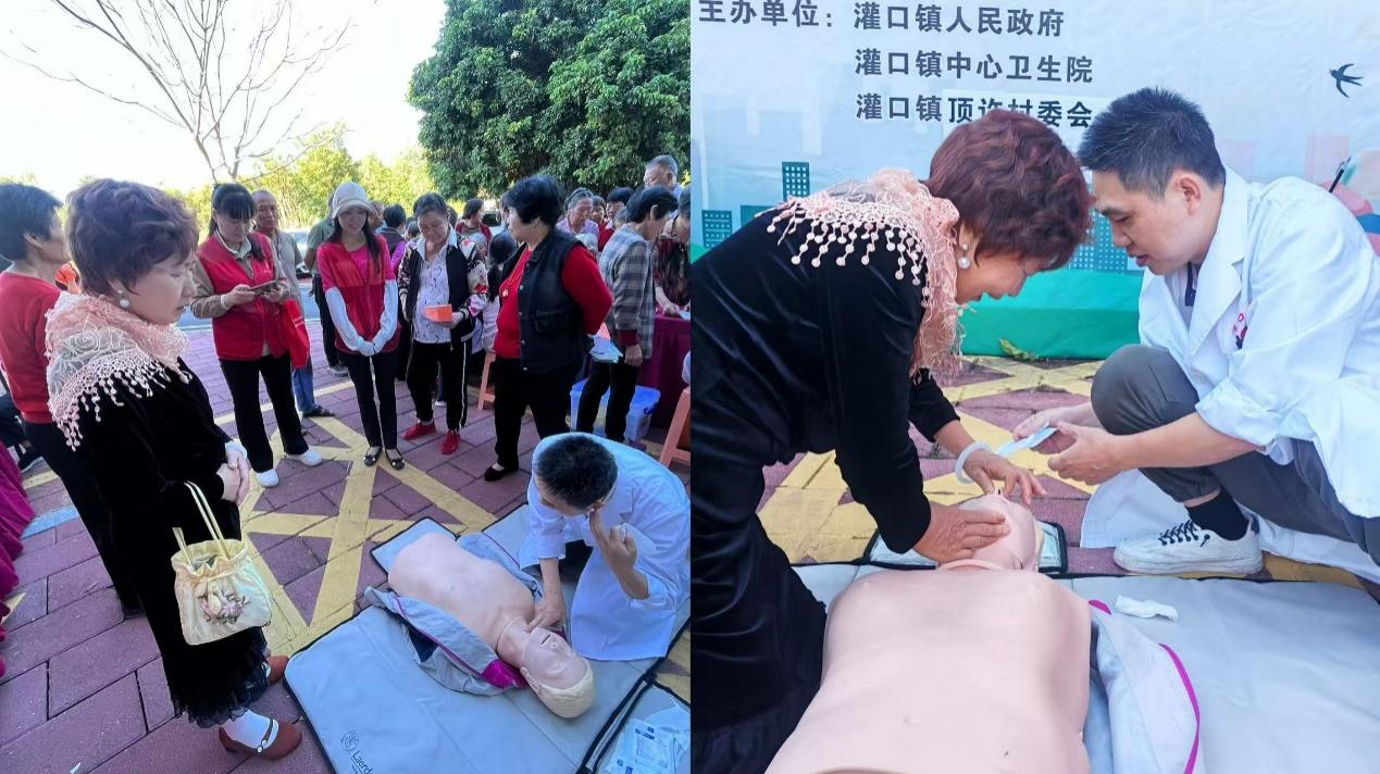 2025年11月14日是第19个世界糖尿病日,为增强群众对糖尿病的认识,提高自我预防能力,引导居民选择健康的生活方式,当天上午,农工党集美区卫生健康支部在灌口镇顶许村委会把一场热闹又暖心的“糖尿病与幸福感”主题公益活动搬到了居民家门口。 活动现场最受关注的是心肺复苏急救教学:党员们跪在模拟人旁,从按压位置、力度到节奏,一步步拆解动作,手把手指导实操,把实用的急救技能“揣”进了群众口袋。